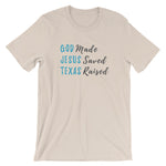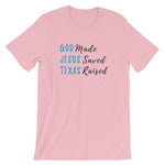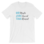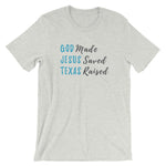 God made. Jesus saved. Texas raised. This t-shirt feels soft and lightweight, with the right amount of stretch. It's comfortable and flattering for both men and women.