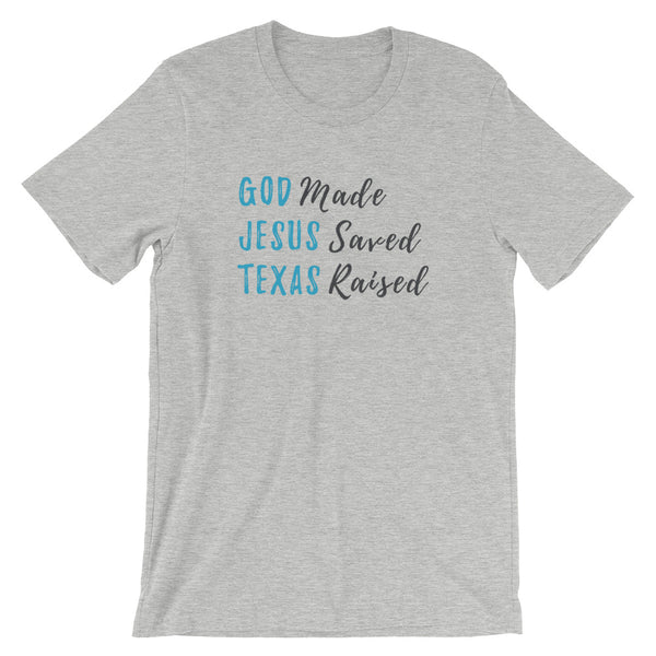 God made. Jesus saved. Texas raised. This t-shirt feels soft and lightweight, with the right amount of stretch. It's comfortable and flattering for both men and women. • 100% combed...